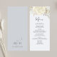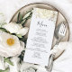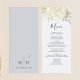 This design features an elegant modern simple wedding menu card, With a calligraphy script, white rose, and floral greenery, with a light blue background, the perfect reception decor.
