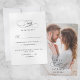 Our elegant Black and White Calligraphy RSVP meal choice response cards features a timeless design. Against a white background, black fonts and elements create a sophisticated look. The reverse side showcases a customisable photo template, along with the couple’s names and wedding date in matching calligraphy – perfectly coordinated with our wedding invitations. This Simple Minimalist Calligraphy Script Wedding RSVP Card combines trendiness with style. Personalise it with your RSVP information to reflect your unique preferences. Elevate your wedding stationery with this modern design, ensuring every detail is memorable.