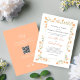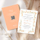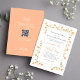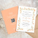 This design features a wedding invitation template with an elegant, classic, classy modern minimal style, with a simple elegant calligraphy script, and a peach floral boho greenery style, with traditional wording, The back features a scannable QR Code for easy guest RSVP.
