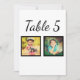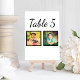 Elegant and unique custom wedding table number cards feature childhood photos of the bride and groom at an age that corresponds with the table number. To customise: type in the table number, click "change" by the default photos to upload your own digital or scanned photos, and add that individual table number card to your shopping cart. Repeat for all of the table numbers that you need. Black script custom text on a white (can be customised) background colour.