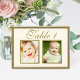 Elegant and unique custom wedding table number cards feature childhood photos of the bride and groom at an age that corresponds with the table number. To customise: type in the table number, click "change" by the default photos to upload your own digital or scanned photos, and add that individual table number card to your shopping cart. Repeat for all of the table numbers that you need. Antique gold script custom text on a light ivory (can be customised) background colour.