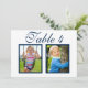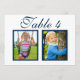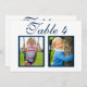 Elegant and unique custom wedding table number cards feature childhood photos of the bride and groom at an age that corresponds with the table number. To customise: type in the table number, click "change" by the default photos to upload your own digital or scanned photos, and add that individual table number card to your shopping cart. Repeat for all of the table numbers that you need. Navy blue script custom text on a white (can be customised) background colour.