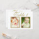 Elegant and unique custom wedding table number cards feature childhood photos of the bride and groom at an age that corresponds with the table number. To customise: type in the table number, click "change" by the default photos to upload your own digital or scanned photos, and add that individual table number card to your shopping cart. Repeat for all of the table numbers that you need. Antique Gold script custom text on a white (can be customised) background colour.