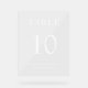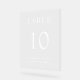 Simple clear acrylic wedding reception table number sign featuring "Table" and the table number in elegant white serif typography, and your names and your reception date in modern white typography. Create each table number individually and add to your shopping cart one at a time, then check out when all numbers are in your cart.