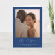 This is a romantic style image featuring a beautifully captured moment of a couple on their wedding day. The warm, golden hues of the sunset create an enchanting and intimate atmosphere, highlighting the joy and love shared between Lauren & Benjamin. The composition focuses on their tender embrace and radiant smiles, set against a soft, blurred background that adds to the dreamy feel. Perfect for expressing gratitude with elegance and warmth, this card captures the essence of celebration and heartfelt appreciation.