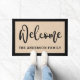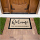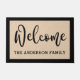 Doormat featuring the text "welcome" in an elegant script font with your family name below on a neutral, slightly textured background and a black border around the edge.