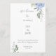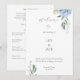 Chic and elegant blue hydrangea flat card wedding programs, featuring a beautiful floral design, a welcome message for guests, your names and date and editable program details at the back. The design is set against a white background, both back and front with text in grey. Space is available to add more wedding party names if required.