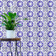 Elegant decorative tile design in Mediterranean style featuring blue ornaments on a white background.