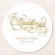A formal, elegant white wedding paper coaster with faux gold calligraphy script.