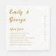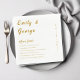 This elegant white-and-gold wedding napkin is perfect for a modern wedding. Its simple design features elegant gold calligraphy of the bride and groom's names, the date of the wedding, and fun facts on a clean white background.