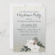 This custom Christmas party invitation features an elegant and classy winter floral theme. A wintery woodland bouquet of flowers is pictured in the bottom right, accented with pine cones, poinsettias, and pine branches. Gold glitter stars border the top and bottom portions over a forest green gradient background.