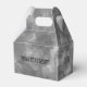 Light grey and white favour box with custom text. Personalised favour boxes with neutral colours. Minimalist gift wrap idea for men and women.