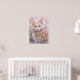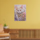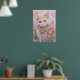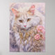 A poster with a lovely illustration. A long haired white cat looking regal and elegant. Surrounded by pink flowers, gold and diamond jewellery.