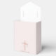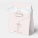Elegant communion favour box with a floral cross on a blush pink background and a hand lettered script name. Personalise with name, text and date.
