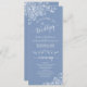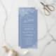 This beautiful wedding program features an elegant design with white text on a dusty blue or periwinkle coloured background and lacy white curls and swirls in the corners. The titles are written in fancy script calligraphy, and there is space for your ceremony and wedding party details, as well as a short thank you for your guests. Wonderful way to welcome your friends and family to your wedding celebration.