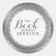 Elegant silver floral circle lace frame with white floral damask background, customisable bok sticker template.