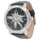Pretty wrist watch with a photo of a single Alpine flower bloom of an Edelweiss, on a black background.  White dots and numbers decorate around the outside edge of the face.  Customise to add any text you want.