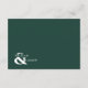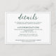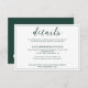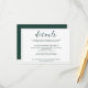 A Modern Wedding Details Enclosure card with a colour theme of white and emerald green/ dark green. It features an elegant calligraphy script and formal serif font with the name of the bride and groom at the back.
