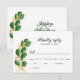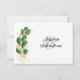 These elegant wedding RSVP cards feature white and green design with emerald green and gold eucalyptus foliage and black typography. Template text makes it easy to personalise with bride and groom's names on a backside and other information on a front side.