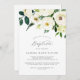 This elegant white floral baptism invitation is perfect for a classic baby baptism. The modern vintage design features beautifully romantic ivory and cream watercolor rose and peony flowers with dark green leaves, greenery and botanicals.