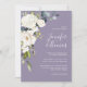 With a popular colour scheme, this wedding invitation design features a cascading bouquet of white watercolor florals with trailing greenery on a lavender purple background. The flowers include roses, hydrangeas and matching mixed florals for a lovely effect. The text pairings used in this design feature the bride and groom's names prominently using a handwritten type face. Personalise the easy-to-use text template with your wedding details.
