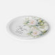Personalised wedding paper plates depict elegant floral watercolor designs with beautiful romantic bouquets of delicate botanical garden peony white flowers and lush greenery. They feature inspirational quote Bible Verse from Ephesians 5:31, "Two shall become One." Customise with names.