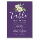 Elegant DIY wedding seating chart and table number. It begins with a dark purple background that frames the white design. A white rose floral posey sits at the top of the table number card that also has the guest names on it. Table is written in a large, modern, carefree flowing script. Number and the table number is on the second line. It is written in a classic serif font. Up to 10 guest names follow. Simply delete the ones you don't need.