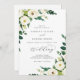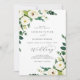 This elegant white floral wedding invitation is perfect for a classic wedding. The modern vintage design features beautifully romantic ivory and cream watercolor rose and peony flowers with dark green leaves, greenery and botanicals.