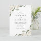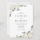 The elegant white floral wedding invitation features your names and wedding details at the centre of the design. Bouquets of painted watercolor eucalyptus leaves, lush green foliage, white and cream roses, and lisianthus flowers are displayed at the corners of the invite. The white rose wedding invitations are perfect for your spring or summer wedding. Designed to coordinate with our Elegant White Floral wedding collection.