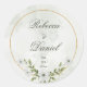 An elegant wedding sticker featuring soft white flowers, delicate greenery, and a refined gold circle for a timeless romantic look. The airy botanical details and graceful monogram styling create a polished design that is perfect for garden weddings, formal celebrations, and coordinated wedding stationery suites. A beautiful choice for couples who love soft floral wedding accents with a fresh, classic, and sophisticated feel. This sticker adds a lovely finishing touch to invitations, envelopes, favor packaging, and wedding day details.