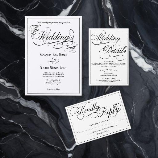 A formal, elegant white save the date postcard featuring with black calligraphy script.