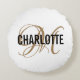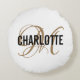 Elegant white round pillow with a gold script initial and a monogram name. Personalise with your name and initial.