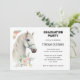 Graduation invitation with a magical illustration of a beautiful white horse head. Surrounded by cute little pink flowers. Boho elegant vibe for horse lovers.