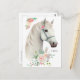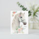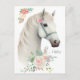 Postcard with a magical illustration of a beautiful white horse head. Surrounded by cute little pink flowers. Boho elegant vibe for horse lovers.