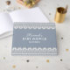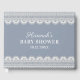 Elegant white lace detailing border on a dusty blue background. Customise the guest book with the name of the mum-to-be and baby shower date.