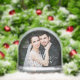 Elegant wedding snow globe keepsake gift for the newlywed couple feature a photo of the bride and groom with white text overlay. Custom wording includes "Mr. and Mrs." in modern calligraphy script with custom married last name and wedding date text in classic serif typestyles.