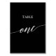 This elegant white on black calligraphy table one table number is perfect for a simple wedding. The neutral design features a minimalist card decorated with romantic and whimsical typography. The card prints on the front and back (double-sided). Other table numbers in the collection are sold separately.