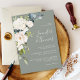 With a popular colour scheme white florals on a sage green background, this wedding invitation design pops with style and charm. It features a cascading corner bouquet of white watercolor florals with trailing greenery. The flowers include roses, hydrangeas and matching mixed florals for a lovely effect. The text pairings used in this design feature the bride and groom's names prominently using a handwritten type face. Personalise the easy-to-use text template with your wedding details.