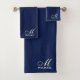 Elegant White Script Initial Monogram Navy Blue Bath Towel Set