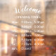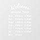 An elegant and minimal business opening hours window cling. Design features 'Welcome' in an elegant white script font. Customise with your business opening times.