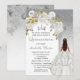 Elegant and classy white with silver-tone accents floral bough combined with an arched panel on a faded silver-grey background "Quinceañera" party design. Features a dark brown to black-haired brunette beauty in a flowing white and silver-coloured ball gown and a faux alcohol ink and glitter marbled back. Composite design by Holiday Hearts Designs.