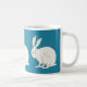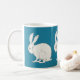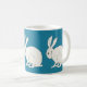 This coffee or tea mug is circled with three elegant white bunny rabbits in a sitting position on a dark blue background.