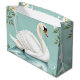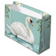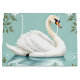 Elegant white swan swimming on water with flowers on pale blue background design.