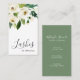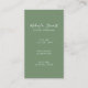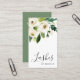Elegant vertical business card with a bouquet of watercolor painted white roses and greenery in the upper left hand corner and your business name with the first line in an elegant handwritten font and your name in a sans serif font. The backside has your contact info in white over a green background. The background may be changed to any colour that you wish. These business cards are great for an eyelash extension professional or cosmetologist.