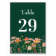 Boho Fall rustic Wildflower Meadow dark emerald green and white wedding table number card featuring original watercolor floral artwork by Catherine Sweetman, perfect for a bohemian or rustic autumn wedding. This design showcases hand-painted wildflowers in a rich, earthy color palette of burnt orange, terracotta, rust, blush pink, peach, purple, coral, soft pink, and golden yellow ideal for fall, late summer, or spring celebrations. The whimsical florals and modern elegant crisp white typography on a rich dark emerald green background and add a romantic touch to your wedding reception, helping guests find their seats in style. Fully customizable to match your wedding décor, these table numbers make a beautiful and functional addition to your boho wedding tablescape. Great for outdoor weddings, garden receptions, or nature-inspired events.