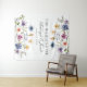 Pretty wildflowers decorate the bottom of this colorful spring wedding photo booth backdrop. Watercolor floral borders are perfect for a garden ceremony outdoors while flowers are in bloom. Elegant script dances above a beautiful orange, purple, yellow, and blue botanical meadow on this custom event tapestry.