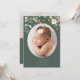 This simple, beautiful photo birth announcement features an elegant oval shaped vertical photo on the front and cascading colourful vintage style botanical wildflowers falling from the top, over the top of the baby's photo. "Introducing" your baby girl in elevated script font, and simple, classic storybook style font typography details for the baby's name and birth statistics including date, weight, and length. The back side offers an opportunity to send a personalised heartfelt family custom message and includes another photo, this time horizontal, for a total of two photos included on this customisable birth announcement template. All done in beautiful soft pastel shades of pink, coral, peach, green, blue, yellow, and red.