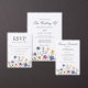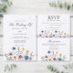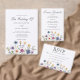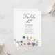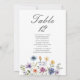 Pretty wildflowers decorate the bottom of this colorful spring wedding table number card with guest names. Watercolor floral borders are perfect for a garden ceremony outdoors while flowers are in bloom. Elegant script dances above a beautiful orange, purple, yellow, and blue botanical meadow on this personalized decor.