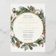 Elegant Winter-themed wedding invitation features a gold frame surrounded by watercolor evergreen, pines and winter florals. Personalise with your information or click "Click to customise further" to edit font styles, size and colours. Choose from gold, silver and rose gold foil options.