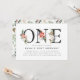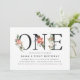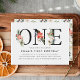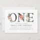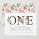Stylish, elegant first birthday invitations featuring dark grey letters with red watercolor poinsettias, ivory roses, holly berries and green foliage accents. Personalise the holiday/winter-themed 1st birthday party invitations by adding your party details. The reverse side of the invitations feature a winter floral watercolor pattern against a white background.
